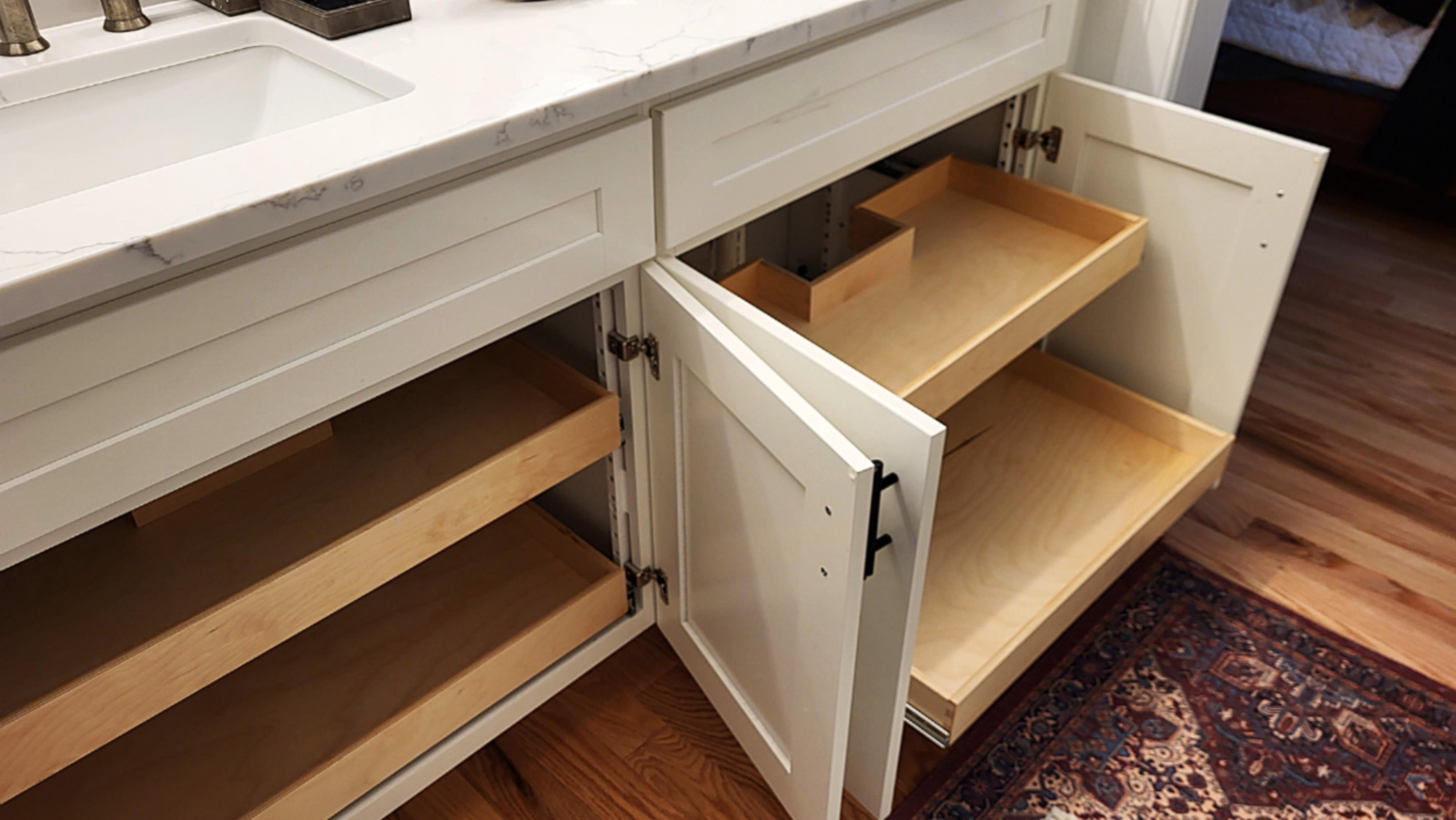 Upgrade the function of your existing cabinets with professionally installed roll‑outs and storage accessories. Whether it’s a kitchen, pantry, bath, or laundry room, we create tailored solutions that add convenience and organization where you need it most. Our offerings include roll‑out trays, trash pull‑outs, U‑shaped vanity roll‑outs, drawer dividers, spice organizers, and more—each designed to fit your cabinetry and your daily routine.